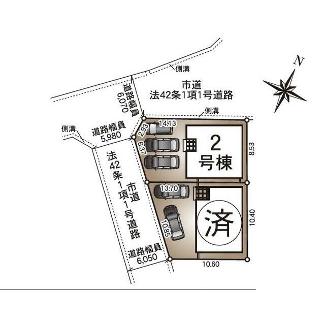 | 用途地域 | 1種住居 | 接道状況 | 北6.0m 公道 接面14.1m 南西5.9m 公道 接面6.3m |
