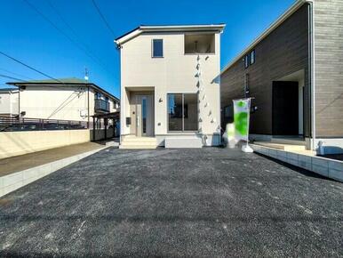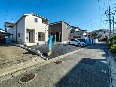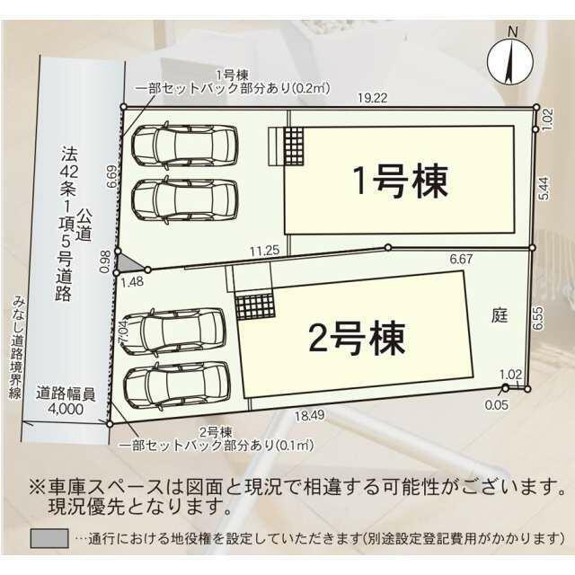 号棟番号:1号棟 土地面積に隅切り部分約0.72平米含む 建物面積に別途ルーフバルコニー約6.48平米有り 西側道路:法42条1項5号の位置指定道路は公道となります 駐車場2台(車種による) |